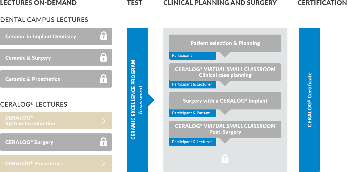 Our renowned lecturers and experts demonstrate the latest techniques based on scientific evidence in using ceramic implant systems. Participants are expected to be familiar with the clinical processes upon successful completion of the program. Lectures on the unique CERALOG® 2-piece ceramic system demonstrate the surgical and prosthetic options available when using CERALOG® implants.